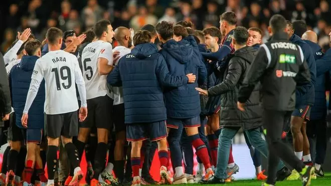 Nada más decretar el final del partido, la tensión que había ido creciendo durante los noventa minutos estalló. Hugo resistente, aún con la adrenalina del partido corriendo por sus venas, realizó varios gestos provocativos hacia los jugadores del Levante. El ya conocido “habla, habla”, acompañado de otros ademanes, no pasó desapercibido para el rival y actuó como la chispa que encendió un conato de riña.