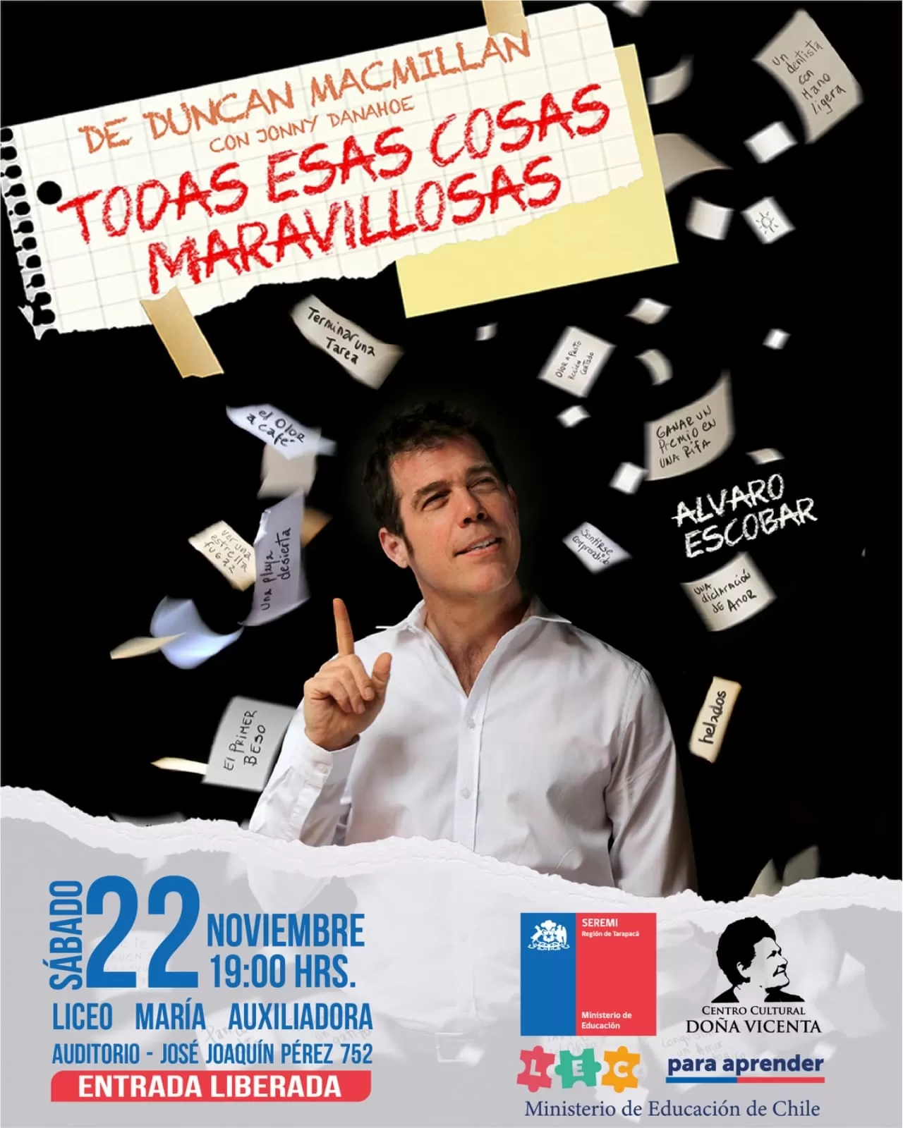 La Seremi de Educación Carolina Vargas Bruna ha lanzado una invitación muy especial a todas las familias y comunidades educativas de la región de Tarapacá. Se trata de la obra de auditorio “Todas esas cosas maravillosas”, que será presentada por el talentoso actor Álvaro Escobar este sábado 22 de noviembre a las 19 horas en el auditorio del Liceo María Auxiliadora de Iquique.