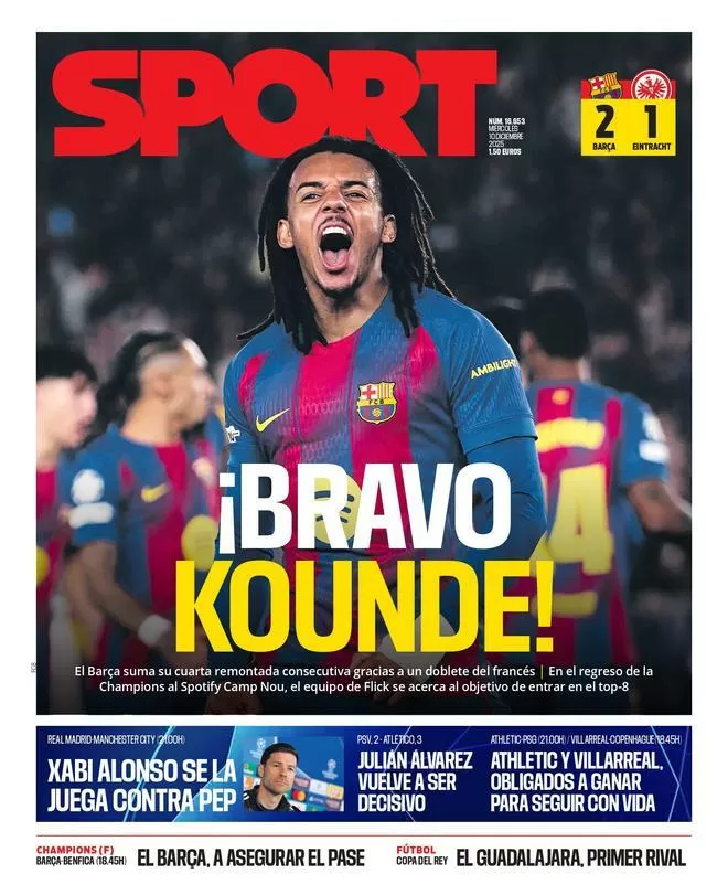 La portada de SPORT de este miércoles está dedicada a un jugador en particular: ¡BRAVO KOUNDE! Y no es para menos, ya que el futbolista del Barcelona fue el protagonista indiscutible del partido contra el Eintracht en la Champions League. Con un doblete, Koundé fue fundamental para que su equipo obtuviera una importante victoria en su camino alrededor de los octavos de final.