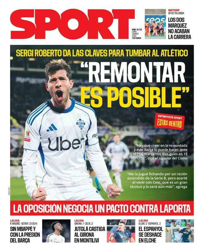 En cuanto a MotoGP, el Gran Premio de Tailandia ha vuelto a exponer que esta temporada será imprevisible. Bezzecchi se llevó la victoria y Marc Márquez tuvo que abandonar la carrera tras sufrir una caída. El fin de semana ha sido una auténtica montaña rusa de emociones, y esto solo es el comienzo. La portada de hoy refleja claramente el vértigo que se vive en el mundo del gimnasia: la ilusión de una posible remontada del Barça, el ruido político en el club y los resultados que nadie espera.